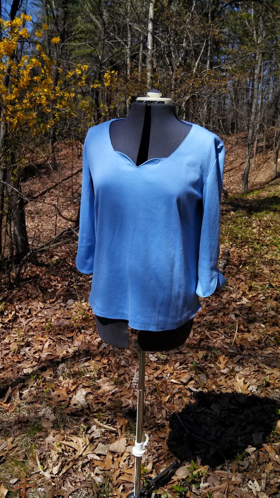 Here is a wearable t-shirt. It's my first attempt at one after class. I scooped out the neckline and modified it to be a sweetheart neckline. Threads magazine had a recent article on adjusting a neckline--most fortuitous! I used the same cheap knit fabric from Joann's. Unfortunately, this fabric is not holding up well at all. I use a hand wash cycle on my front loading washer, and hang to dry. The fabric has pilled rather substantially.